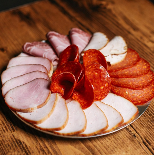 Крылья острые, шашлык куриный, шашлык свиной, шампиньоны в беконе, картофельные дольки, соус: смородина, красный, чесночный